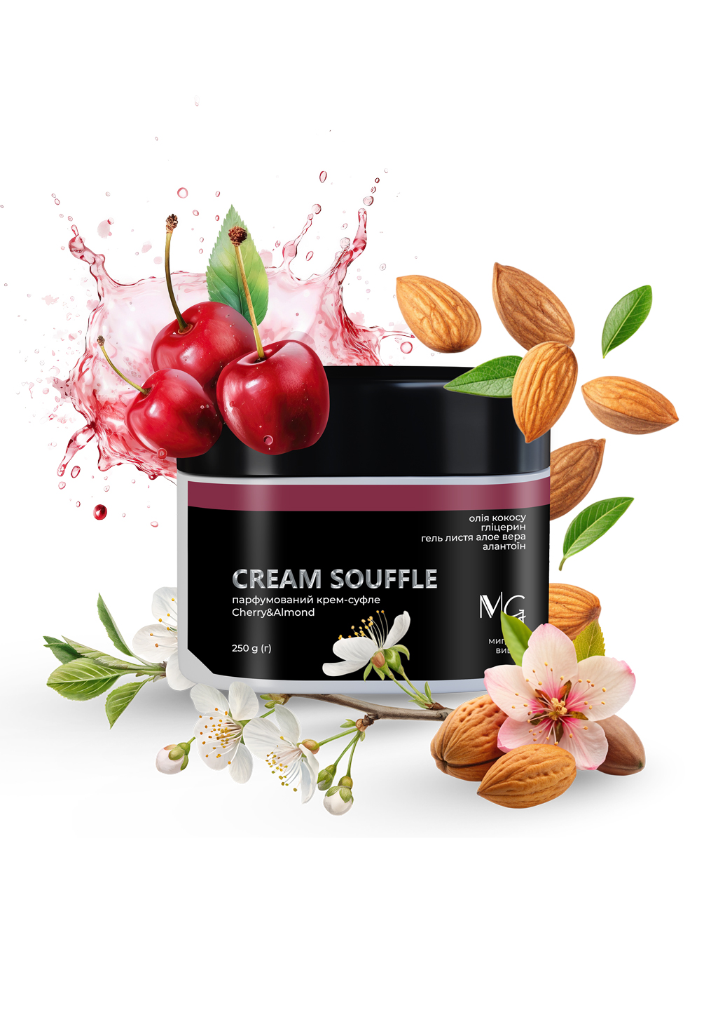 Крем-суфле парфумований "Cherry & Almond" від бренду MG - для тіла має консистенцію батеру. Така текстура сприяє зволоженню та живленню Вашої шкіри, робить її шовковстою та ніжною на дотик без відчуття плівки та липкості, огортає витонченим ароматом з нотами мигдалю, вишні та лікеру.